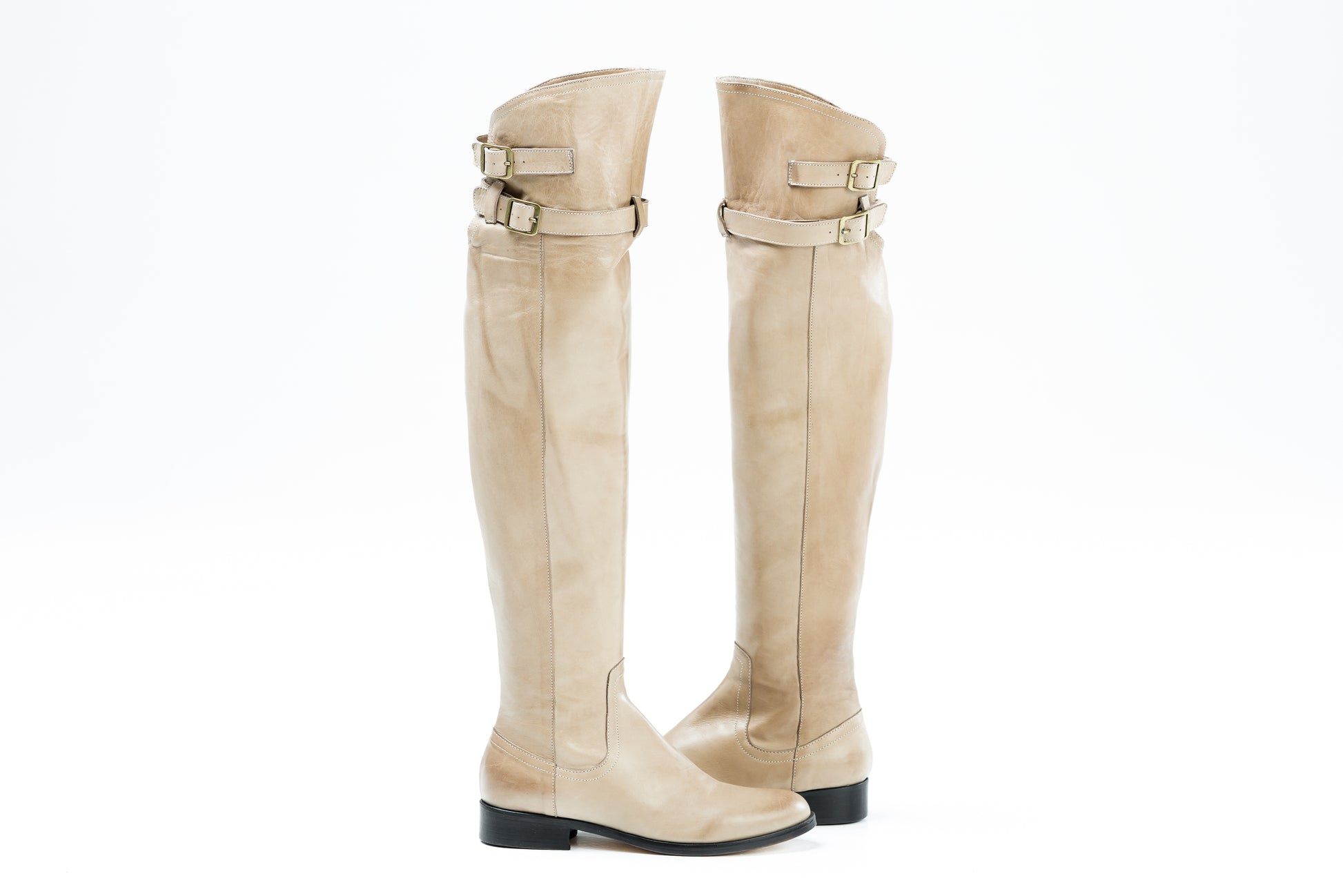 Discover timeless elegance with these over-the-knee leather boots, designed for the discerning individual. The premium leather upper extends gracefully to just above the knee, whilst a practical side zipper ensures seamless dressing. Refined buckle accents provide subtle visual interest and authentic detail. Built on a comfortable flat sole, these boots transition effortlessly from professional settings to evening occasions. A versatile investment piece that embodies understated luxury and enduring style.