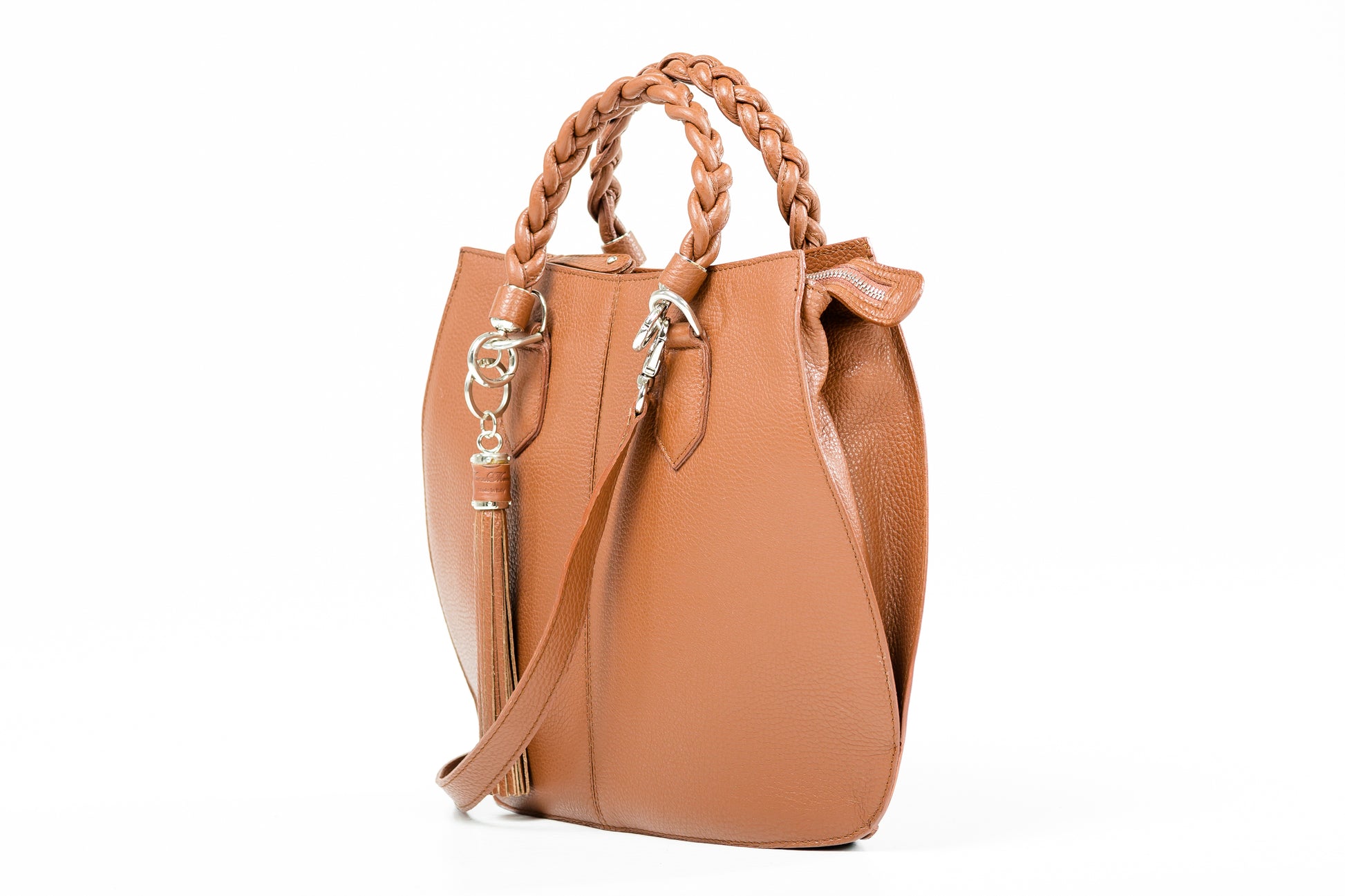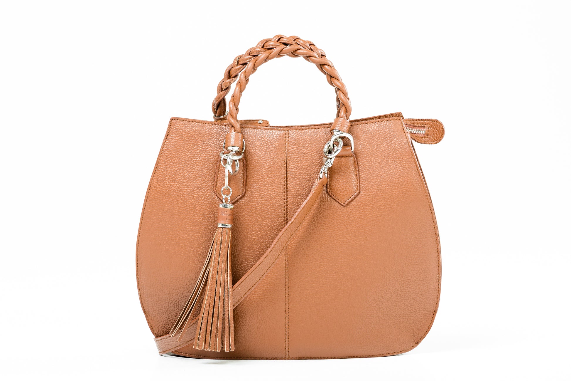 This medium leather tote combines elegance and practicality with its distinctive woven handle and detachable tassels for a refined touch. Designed for versatility, it features extra shoulder straps and thoughtfully arranged internal compartments to keep your essentials organised while on the move. Ideal for those who appreciate understated sophistication and functional style.